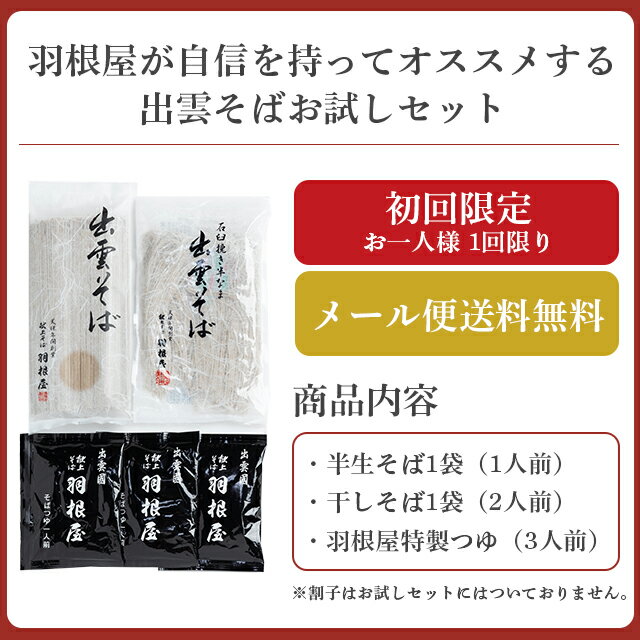 商品説明 名称 「おためしセット(3人前)」 半生そば1袋(1人前) 干しそば1袋(2人前) そばつゆ3袋(3人前) 内容量 半生そば 120g(1袋当たり)×1 干しそば 200g(1袋当たり)×1 そばつゆ 80ml(1袋当たり)×3 原材料名 <半生そば> そば、小麦粉、食塩 ※国内産石臼挽そば粉・北海道産小麦粉を使用しています <干しそば> そば、小麦粉、小麦タンパク、食塩 ※国内産石臼挽そば粉・北海道産小麦粉を使用しています <そばつゆ> 醤油(本醸造)、砂糖、かつお節、そうだかつお節、みりん、乾燥こんぶ (原材料の一部に小麦、大豆を含む) 賞味期限 <半生そば> 製造日より90日(未開封・常温) <干しそば> 製造日より1年間(未開封・常温) <そばつゆ> 製造日より1年間(未開封・冷暗所保存) 保存方法 直射日光を避け、常温で保存してください。