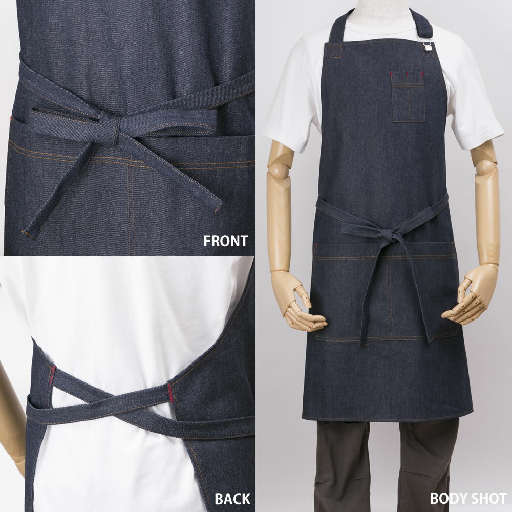 - FRONT/BACK - - DETAIL - - SIZE - 前中心丈 裾幅 首ひも 頭周り F(フリーサイズ) 約87cm 約71cm 約33〜60cm 約46〜66cm ■商品仕様 生地の薄さ 厚手 伸縮性 なし 仕様 首ひも調節可能、腰ひも前結びタイプ、ペン差しポケット付き、前ポケット×2 素材 綿100% 生産国 中国(企画:日本) ご注意 この商品はデニム特有の風合いを最大限に活かすため、ウォッシュ加工をしておりません。