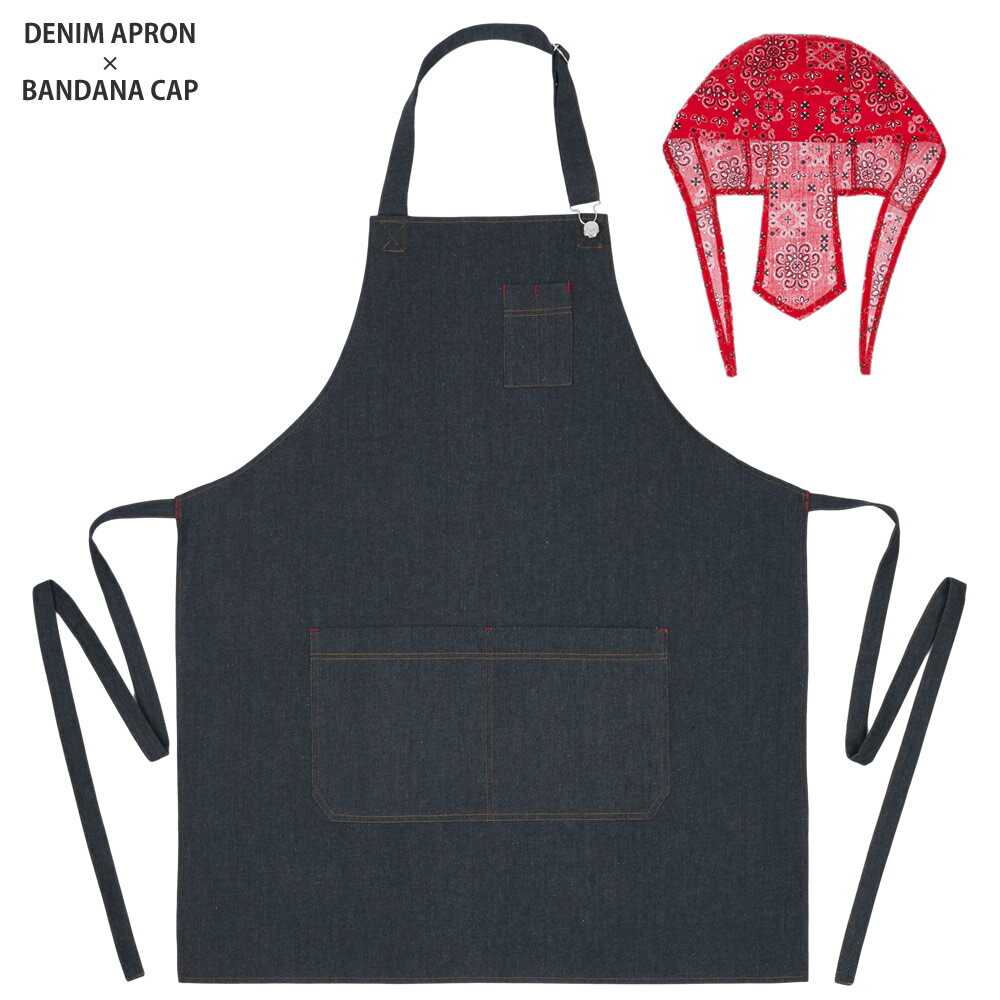デニムエプロンと簡単にかぶれるバンダナ風キャップ付き。