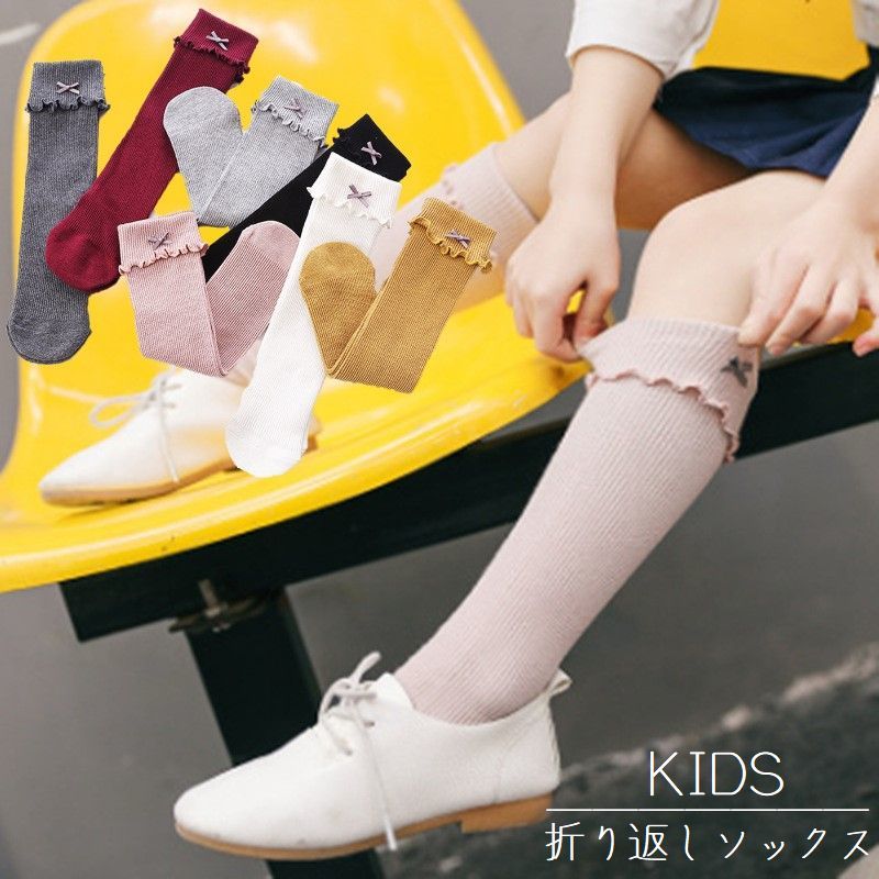 送料無料ハイソックス 折り返しソックス ソックス 靴下 子供用 キッズ 女の子用 無地 折り返し リボン フリル ロング 子供靴下 キッズソックス くつした くつ下 可愛い かわいい お洒落 オシャレ おしゃれ ガーリー キュート カジュアル 子供 こど
