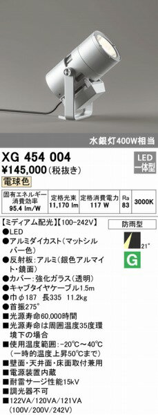 XG454004 オーデリック の返品・交換について XG454004 商品の仕様 メーカー / 型番: XG454004 オーデリック 屋外用スポットライト商品カテゴリ: 照明器具 施設用照明器具 屋外用照明器具 スポットライト 通販ランプ色: LED(電球色)取付方法: 取付・電気工事が必要です。